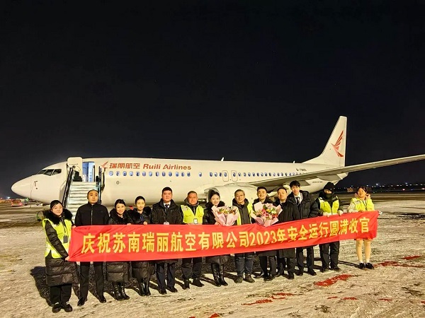 20231231日,随着DR6584、DR5320、DR6504航班先后安全飞抵无锡、沈阳和昆明,苏南瑞丽航空2023年安全运行圆满收官,全年安全飞行超6.8万小时,执行航班22214班,运输旅客超过377万人次。当天晚上,苏南瑞丽航空党委书记、董事长叶亚娟、总经理成军、党委副书记沈平、运行副总罗建训、维修副总陈海等领导一行来到昆明长水机场机坪上,迎接岁末航班的平安归来。当机组成员缓缓从客梯车上走下,公司领导与云南机场集团领导为他们送上鲜花,向他们这一年的辛勤付出表示感谢,致以新年祝福。沈阳基地、无锡基地和德宏芒市机场同期举行了接机仪式,一同庆祝苏南瑞丽航空2023安全年圆满收官。
