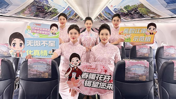 本次主题航班由“吴韵江南”乘务示范组执飞,乘务员身着一袭粉色旗袍,在云端之上为旅客展开一幅流动的春日画卷。示范组为乘机旅客准备了包括无锡小笼包挂饰、惠山泥人、樱花发夹、古琴书签、浪漫花语风车在内的精美伴礼,以江南文化特色装点旅途,为航班增添融融春意。