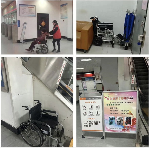 环境“无碍”,夯实出行“硬基底”。无障碍电梯车站出入口均设有无障碍电梯,导向标识清晰醒目。特殊旅客候车室设置特殊旅客候车室供特殊旅客休息等候。无障碍通道设立“绿色通道”,配备轮椅等必要辅助设施,助力特殊旅客出行无忧,无障碍卫生间设置无障碍卫生间,车站工作人员定期进行安全巡视和清洁。如有需要,可直接向车站工作人员寻求帮助。便民服务台服务台提供视力、听力信息援助服务,并设有便民“百宝箱”,配备老花镜、拐杖、雨伞以及感冒药、晕车药等,进一步提升乘客出行体验感和幸福感。