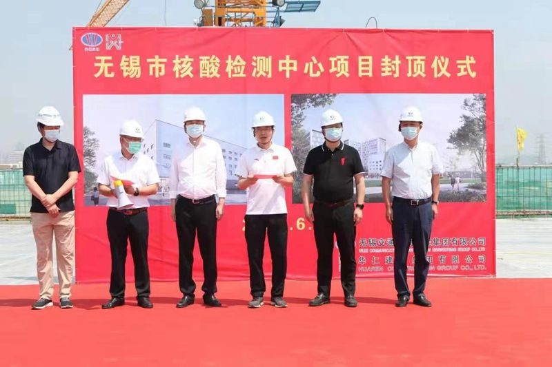 市级核酸检测中心由市财政出资、市卫健委负责立项、建厦发展公司负责代建、交建集团牵头华仁建设、工业设备安装、智汇交通科技组成EPC总承包联合体负责施工。在市区两级政府职能部门、属地政府与街道、各管线主管单位的大力支持下,经过37天的日夜奋战,克服了近期持续高温酷暑等不利天气影响,解决了现场大量渣土外运难题,6月16日上午终于迎来了核酸检测中心项目主体结构封顶的喜庆消息,比原定计划提前了半个月。