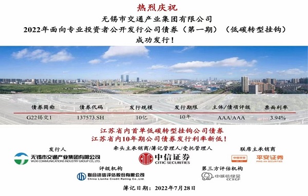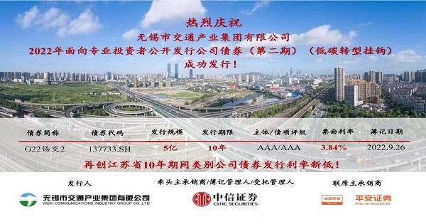 无锡交通集团成功发行江苏首单低碳转型挂钩公司债券